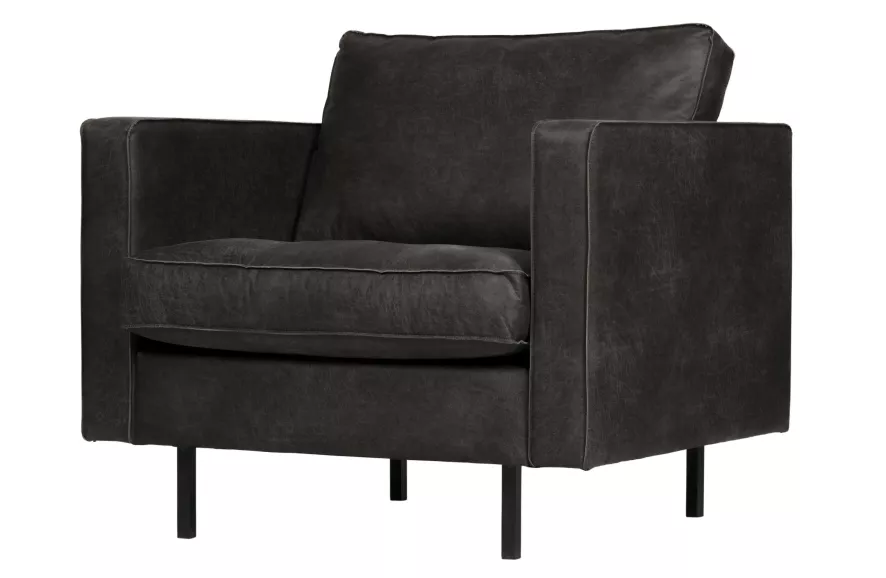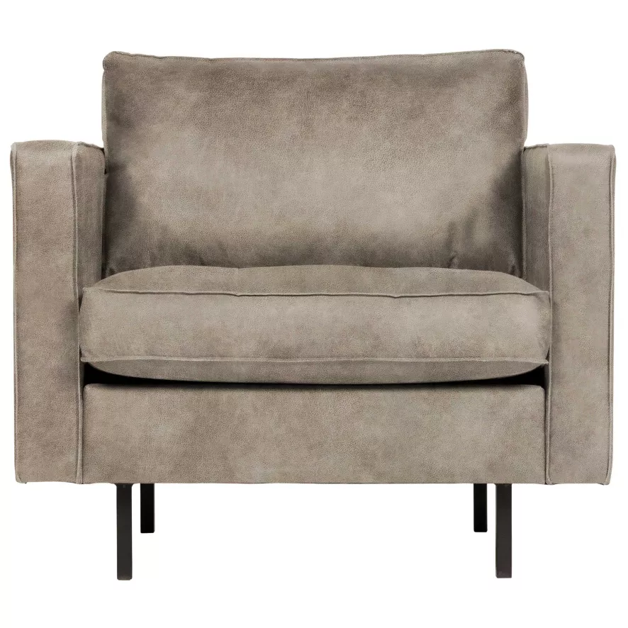 De Rodeo classic fauteuil van BePure is 98 centimeter breed, 88 centimeter diep en 83 centimeter hoog. De zithoogte is 45 centimeter, de zitdiepte is 60 centimeter en de hoogte van de armleuningen is 68 centimeter. De fauteuil is gemaakt van gerecycled leer, wat betekent dat het 70% echt leer is en 30% polyester. De Elephant skin variant is van een materiaal dat lijkt op leer, maar is 50% nylon en 50% polyurethaan. De poten zijn van zwart metaal. Gerecycled leer kan je niet behandelen met vet voor leer. Met een licht vochtige doek kun je de stof schoonmaken, gebruik eventueel een neutrale zeepoplossing voor het verwijderen van vlekken. Na het verwijderen van de vlek moet je de stof even afnemen met een licht vochtige doek.