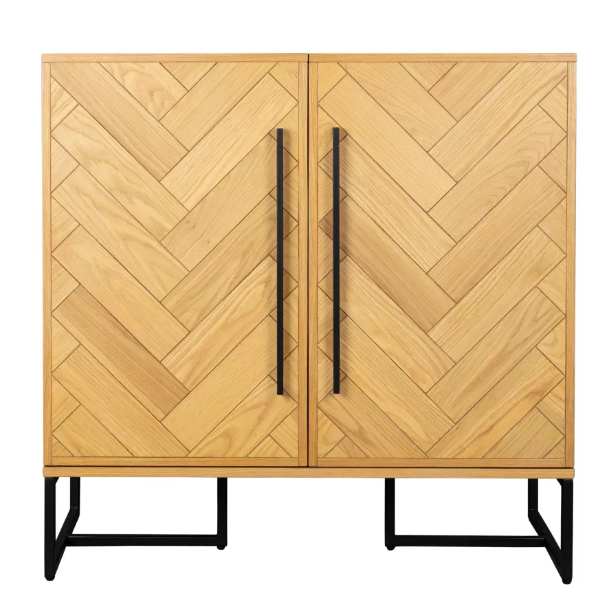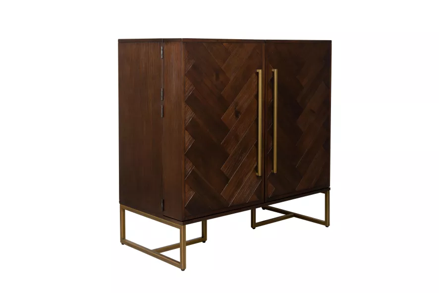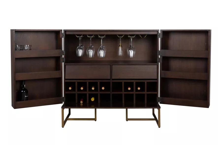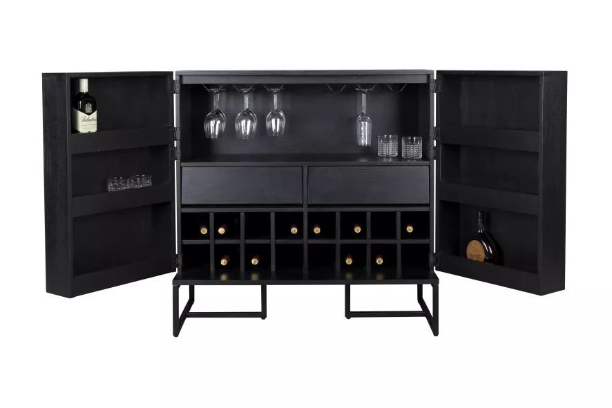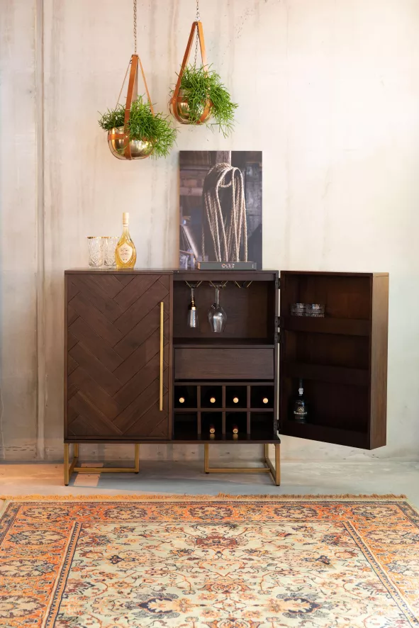 De Class wijnkast van Dutchbone is 100 centimeter breed, 50 centimeter diep en 100 centimeter hoog. De kast is gemaakt van MDF met acaciahouten of eikenhouten fineer en een natuurlijk PU coating. De kast heeft een vissengraatpatroon, stalen poten en handvaten met een antieke messing kleurcoating. De kast heeft een maximale draagkracht van 100 kilogram. De opbergkast heeft twee deuren, een wijnrek en een aantal houders waar je glazen aan op kunt hangen.