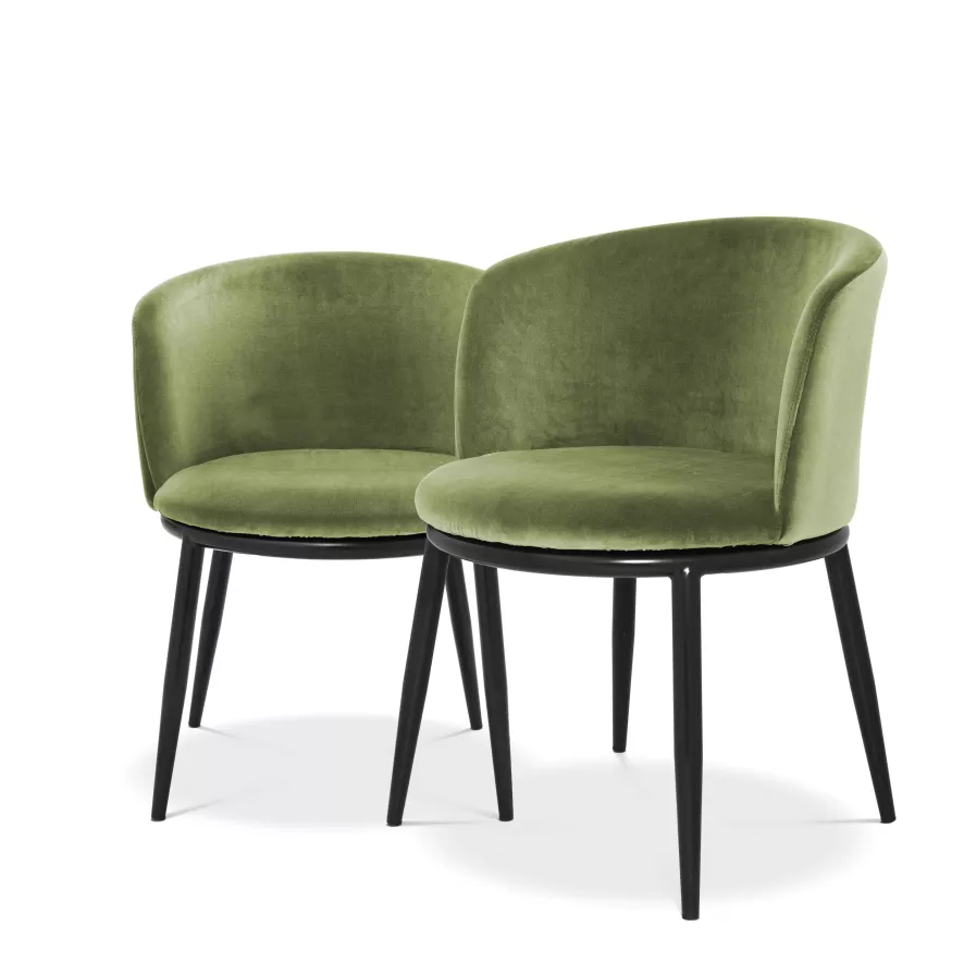 De Filmore eetkamerstoel set van 2 van Eichholtz bestaat uit rondlopende stoelen met elk een breedte van 57 centimeter, een diepte van 57 centimeter, een hoogte van 74 centimeter, een zitdiepte van 47,5 centimeter, een zithoogte van 47 centimeter en een armleuninghoogte van 69 centimeter. De stoelen zijn voorzien van een zwart onderstel en de zitting is bekleed met zachte stof bestaande uit 95% polyester en 5% katoen. De Filmore eetkamerstoelen set is verkrijgbaar in verschillende kleuren. Eichholtz adviseert de stoelen regelmatig stof te zuigen en gemorste vloeistoffen zo snel mogelijk te verwijderen. Maak gebruik van speciale vlekkenreiniger en vermijd het gebruik van agressieve schoonmaakmiddelen.