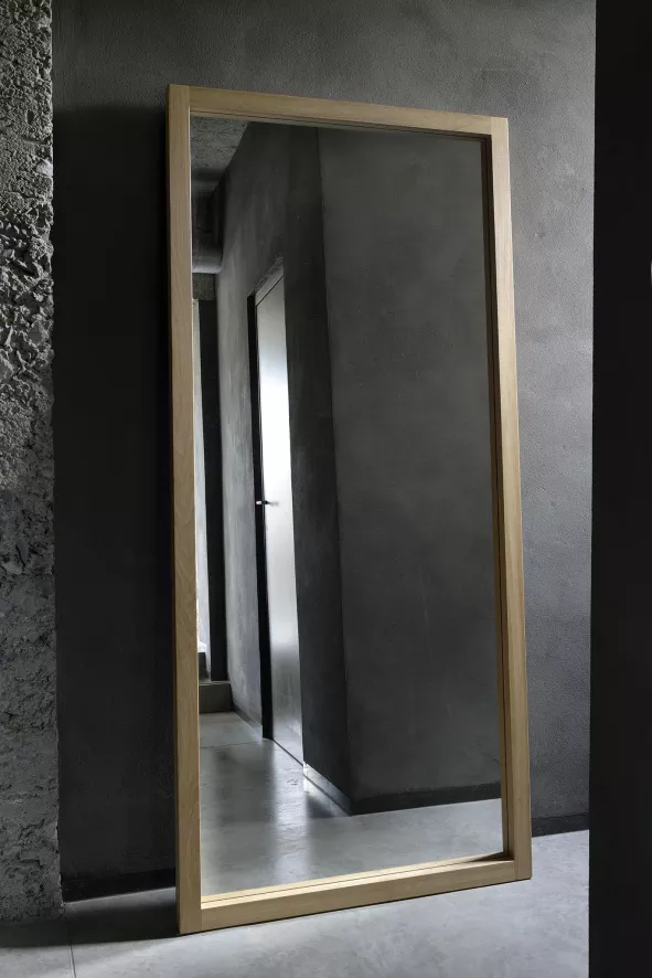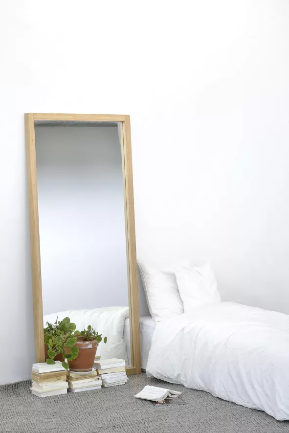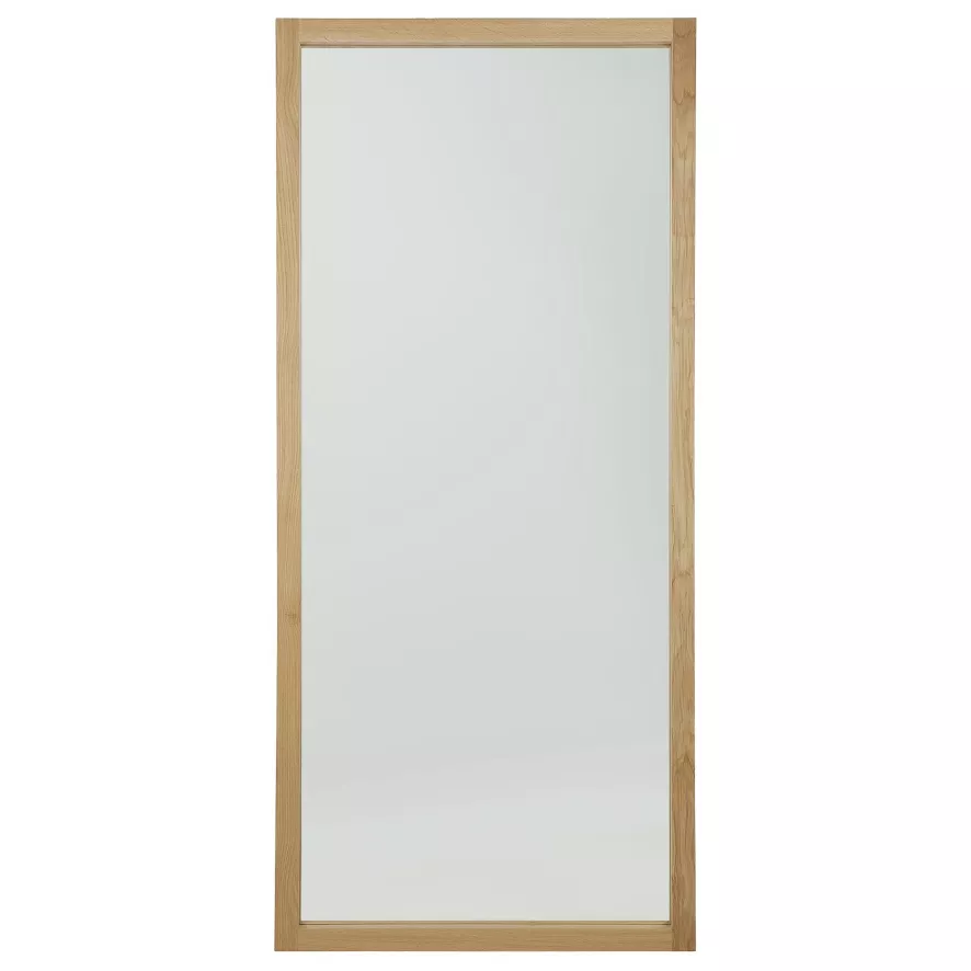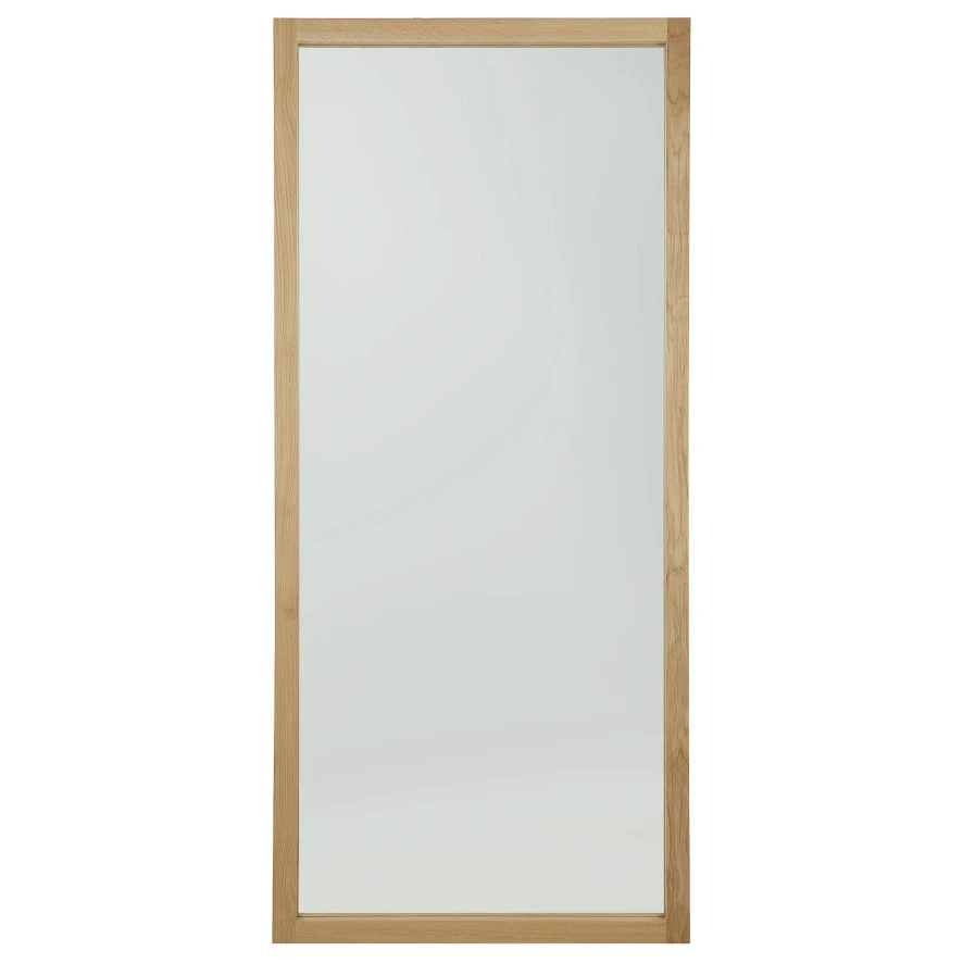 De Light frame spiegel 90×200 naturel eiken van Ethnicraft heeft een breedte van 90 centimeter, een hoogte van 200 centimeter en een dikte van 5 centimeter. Deze spiegel heeft een frame van massief eikenhout dat met een transparante, naturel lak is afgewerkt. De spiegel is gemaakt van spiegelglas. Deze spiegel heeft een gewicht van 30 kilogram en is alleen geschikt voor gebruik binnenshuis.