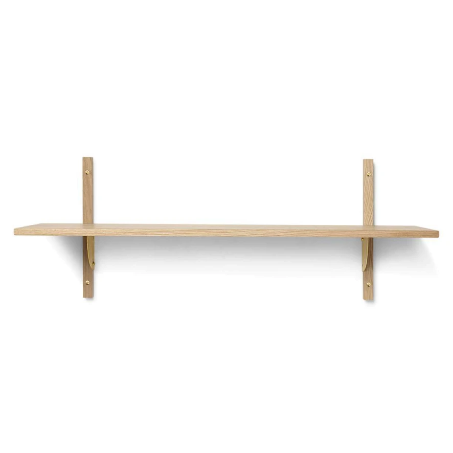 De Sector Shelf wandplank L/S van Ferm Living is 87 centimeter breed, 26,1 centimeter diep en 34 centimeter hoog. De wandplank is gemaakt van multiplex met eikenfineer en kan je schoonmaken met een vochtige doek. De Sector Shelf wandplank is verkrijgbaar in verschillende maten. Ook kan je kiezen voor een eikenhouten kleur of zwarte kleur van de planken en een messing kleur of zwarte kleur van de schroeven en details.