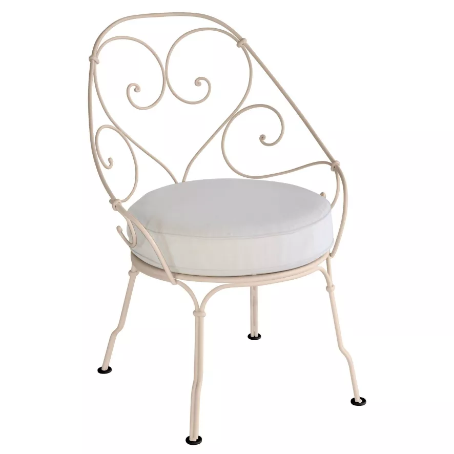 Dit is het Fermob 1900 fauteuil met off-white zitkussen.