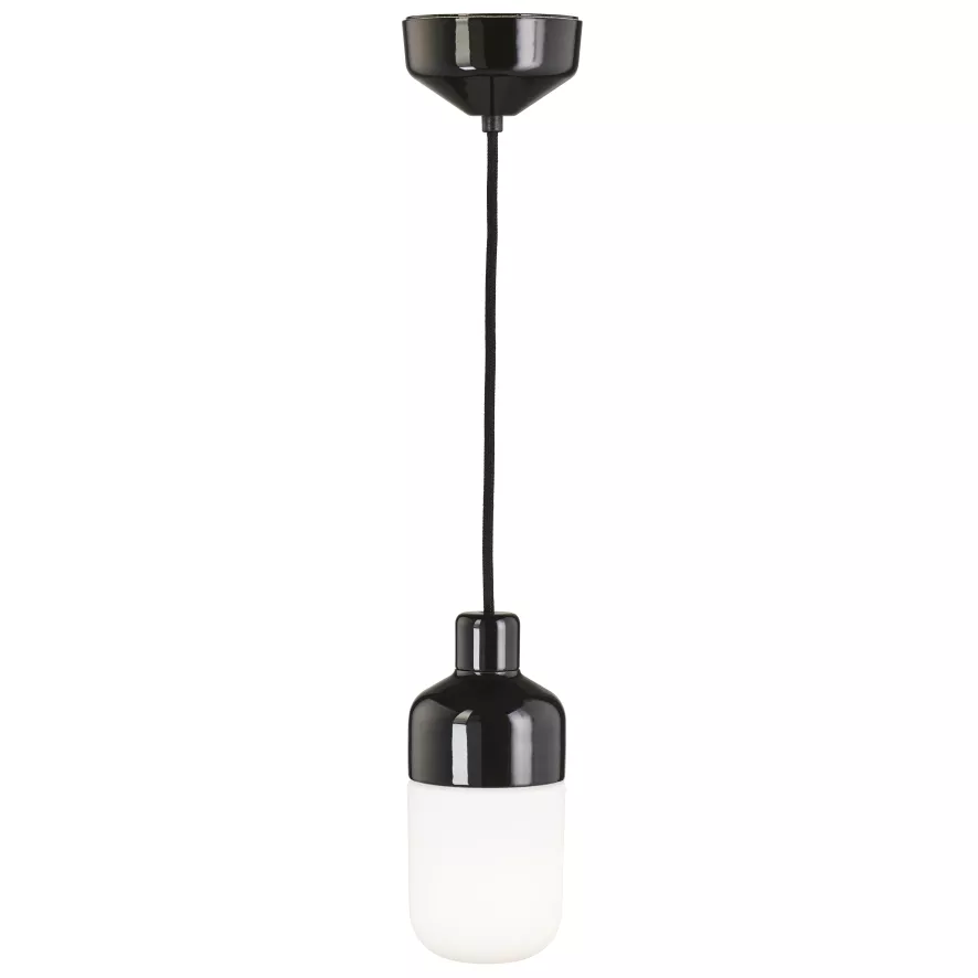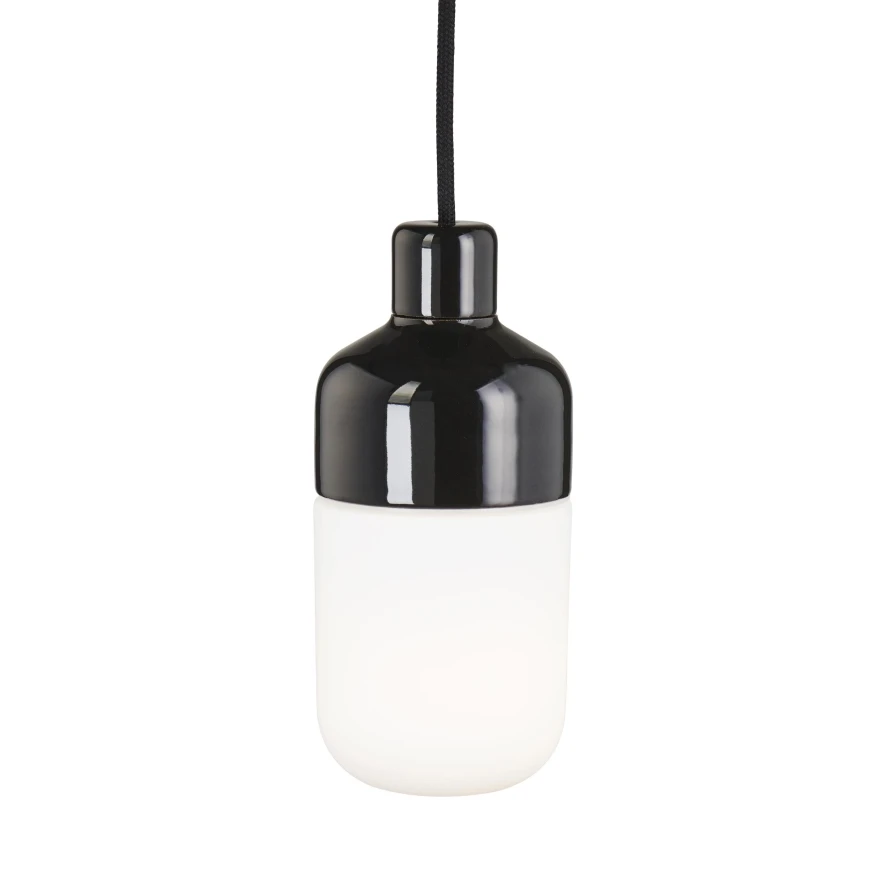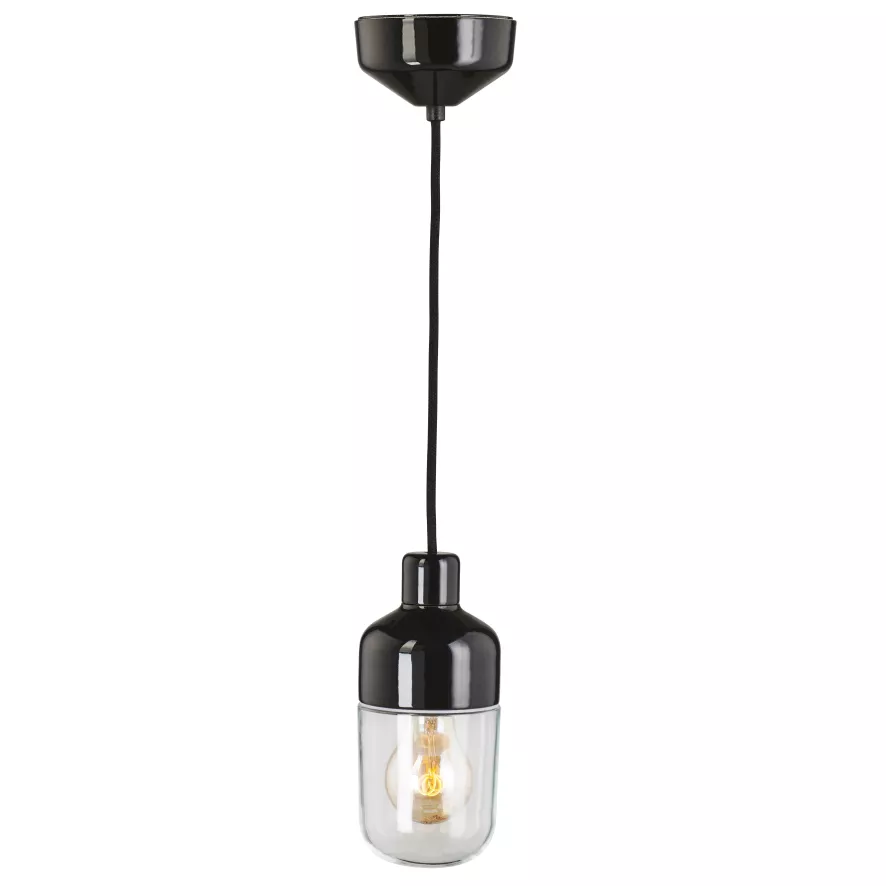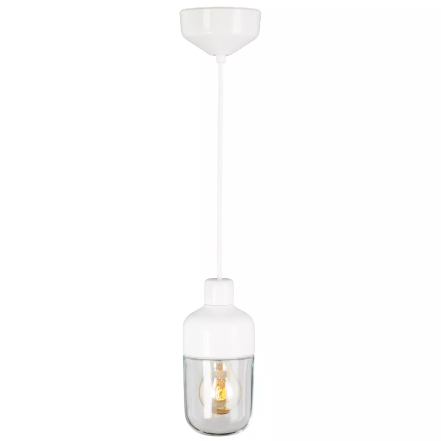 Dit is de Ohm hanglamp 100/215 helder glas IP44 van Ifö Electric. De hanglamp is 215 millimeter hoog en heeft een diameter van 98 millimeter. Het bijgeleverde snoer is 200 centimeter lang. Deze hanglamp is gemaakt van porselein en helder glas. In de lamp zit een E27 fitting, geschikt voor een lichtbron met een maximaal wattage van 40. Deze lichtbron wordt niet meegeleverd. Deze hanglamp is beschikbaar in twee kleuren: zwart en wit. Ook is er een variant beschikbaar met opaal glas.