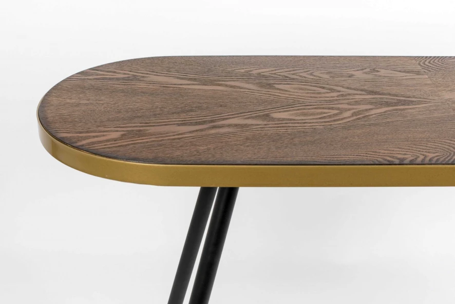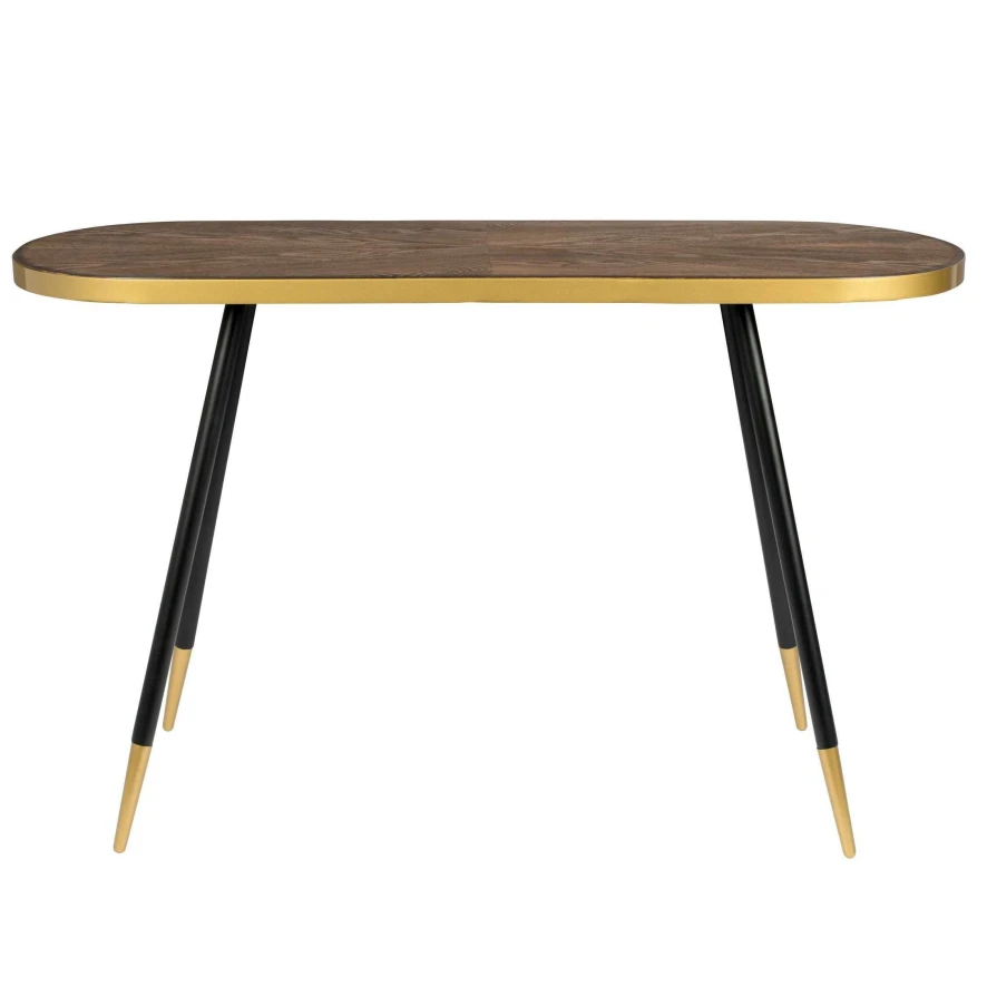 De Huntly console tafel van Livingstone heeft een diameter van 61 centimeter en een hoogte van 40 centimeter. Het MDF tafelblad heeft een essenhouten fineerlaag met een walnoothoutkleurig patroon. De zwarte, slanke poten van de console tafel zijn gemaakt van gepoedercoat ijzer.