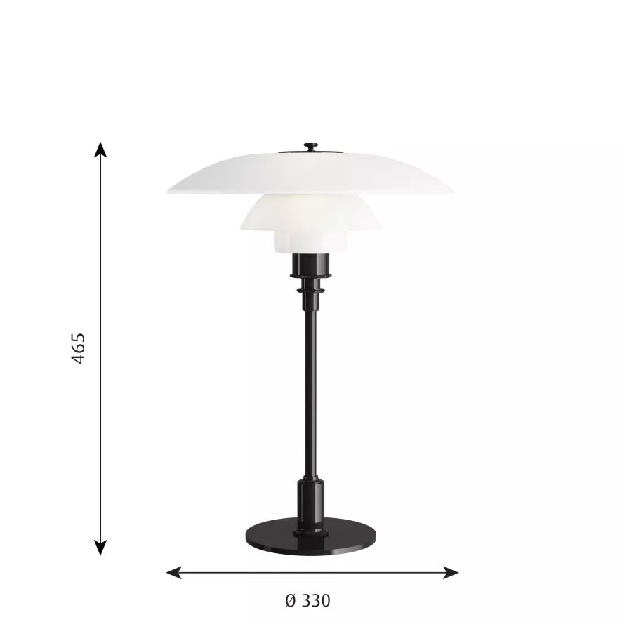 De PH 3,5-2,5 tafellamp glas van Louis Poulsen heeft een diameter van 330 millimeter en een hoogte van 465 millimeter. Voor de basis van de lamp kan je kiezen uit zwart gemetalliseerd of hoogglans verchroomd. De schermen zijn gemaakt van wit opaalglas. In de tafellamp gebruik je een E14 lichtbron van 60 watt.