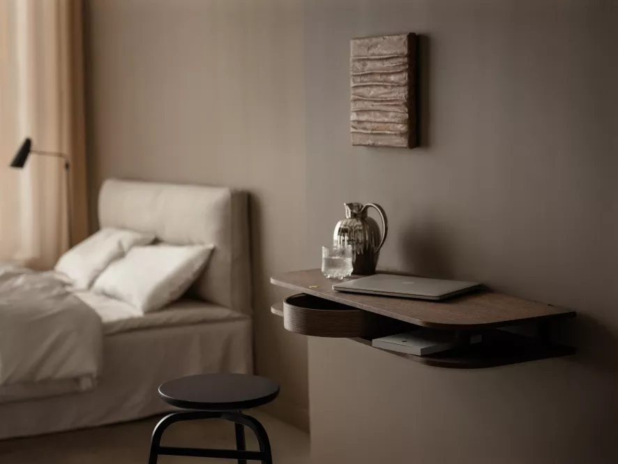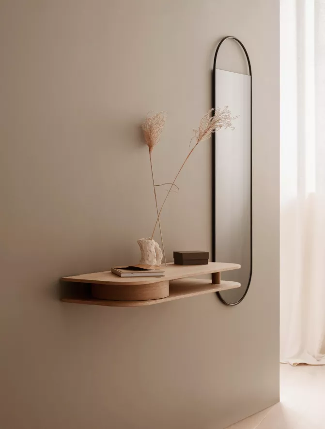 De Valet wand console tafel large heeft een lengte van 92 centimeter, een diepte van 35 centimeter en een hoogte van 10 centimeter. De console weegt 8 kilo en is gemaakt van MDF, eikenfineer en massief eikenhout. De binnenkant van de lade is gemaakt van leer. De console is verkrijgbaar in verschillende kleurvariaties en in een kleiner formaat.