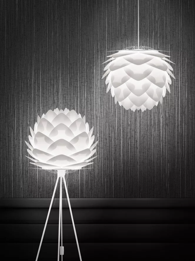 De Sylvia mini vloerlamp met wit onderstel van Umage heeft een lampenkap met een hoogte van 27 centimeter en een diameter van 34 centimeter. De lamp wordt geleverd met een wit onderstel gemaakt van aluminium. Het onderstel heeft een diameter van 66 centimeter en een hoogte van 109 centimeter. De Sylvia vloerlamp is verkrijgbaar in de kleuren: wit, koper of staal. Het materiaal van de lamp is polypropeen. De lamp heeft een E27 fitting, de lichtbron is exclusief. De Sylvia lamp is ook als plafond- en tafellamp verkrijgbaar. Umage doneert voor iedere verkochte kunststof lamp 5% van de omzet aan het opruimen van de zee en verpakt de verlichting in herbruikbare giftboxes.