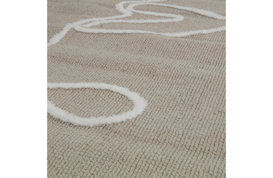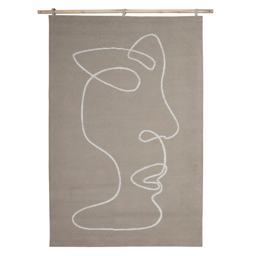 Het Zeno wandkleed woondecoratie 160×230 van Woood heeft een vergrijsde groentint met een abstracte lijntekening in de vorm van een gezicht. De wandkleed is 160 centimeter breed, 230 centimeter hoog en 1 centimeter dik. Het kleed weegt 10,5 kilogram. Het wand tapijt is machinaal geweven van kunstmatige vezels (polyester).